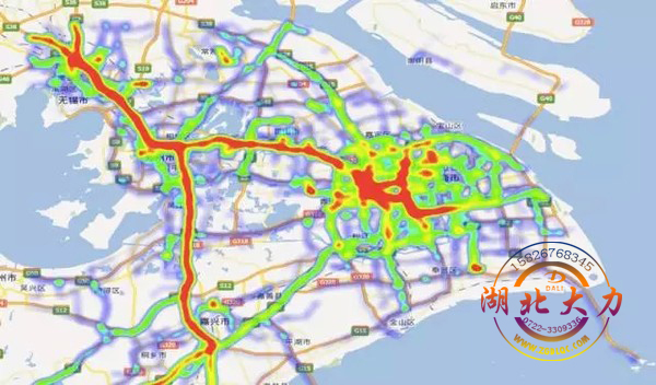 這是一天之內(nèi)車輛的流動密度情況。大家看到里面有非常大的兩條紅線,這兩個紅線意味著非常多的車,非常多的火車要經(jīng)過這兩條線。中間這一塊紅的,意味著非常多的車在這個區(qū)域里。