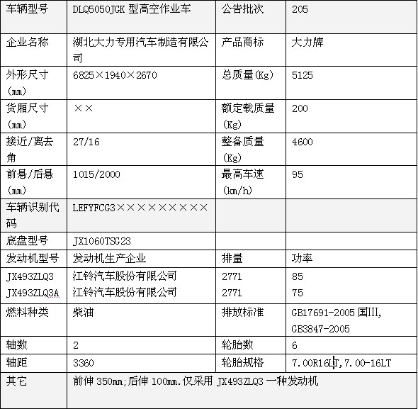 下列是湖北大力專用汽車有限公司江鈴14米高空作業(yè)車主要技術(shù)參數(shù)及性能: