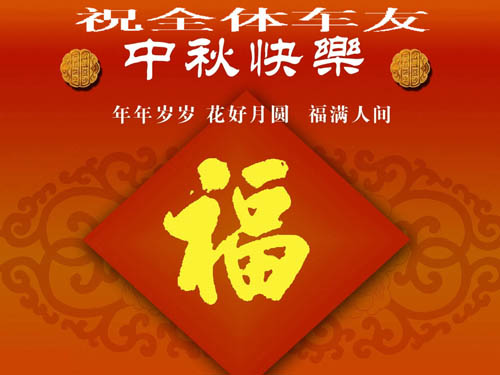 今天是922日 ,我國傳統(tǒng)節(jié)日,中秋佳節(jié),在這樣一個喜慶的日子里,我謹代表大力公司向全體員工以及關(guān)心過我們的企業(yè)及個人表示真誠的祝福,希望各位員工及車友中秋節(jié)玩得開心、快樂!