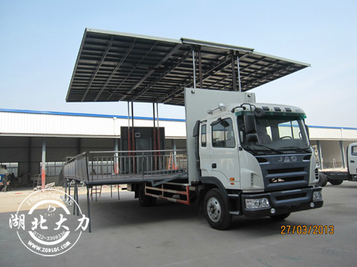 商品展銷(xiāo)車(chē),選用福田底盤(pán),3360軸距,整車(chē)長(zhǎng)約5.995米,上藍(lán)牌,C照可以開(kāi),舞臺(tái)面積18-24平方;為了滿(mǎn)足不同需求的用戶(hù),駕駛室有兩種配置,一種經(jīng)濟(jì)實(shí)惠的窄體駕駛室,另一種是豪華大氣的寬體駕駛室,可以選裝方向助力和空調(diào);側(cè)面展開(kāi)舞臺(tái)面積在16平方左右,配有舞臺(tái)梯、燈光架、幕布掛鉤及電源箱。