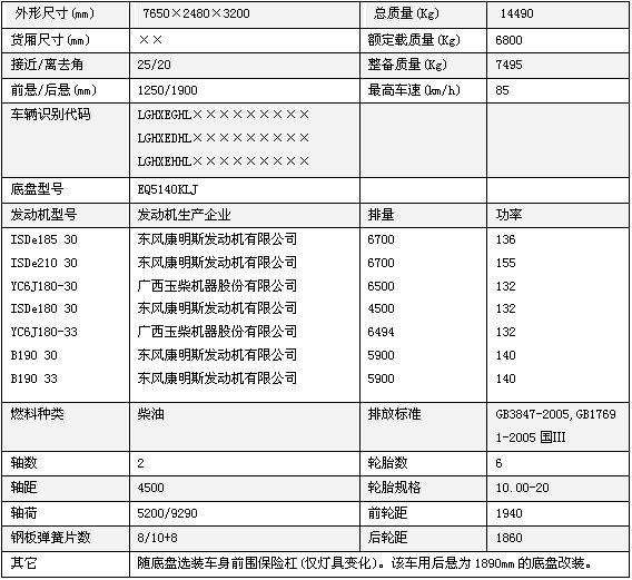 隨底盤選裝車身前圍保險(xiǎn)杠(僅燈具變化)。該車用后懸為1890mm的底盤改裝。